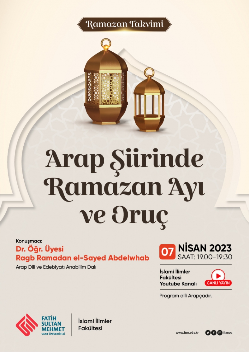 Şiir, şairin enfüs ve afaktaki hayata dair inanç, aksiyon, fikir ve hislerini dile getirir. Bu sebeple şairlerin gerek kendi inanç, amel, fikir ve hisleri, gerekse içinde yaşadığı toplumun inanç, amel, fikir ve hisleri şiirlerine yansır. Ramazan ayı ve oruç Müslüman toplumların dini edebiyatında işlenen temaların önde gelenlerindendir. Fakültemiz öğretim üyelerinden Dr.Öğr.Üyesi Ragb Ramadan el-Sayed Abdelwhab’ın konuşmacı olarak katılacağı Arap Şiirinde Ramazan Ayı ve Oruç konulu programı zevkle izleyeceğinizi umuyoruz.