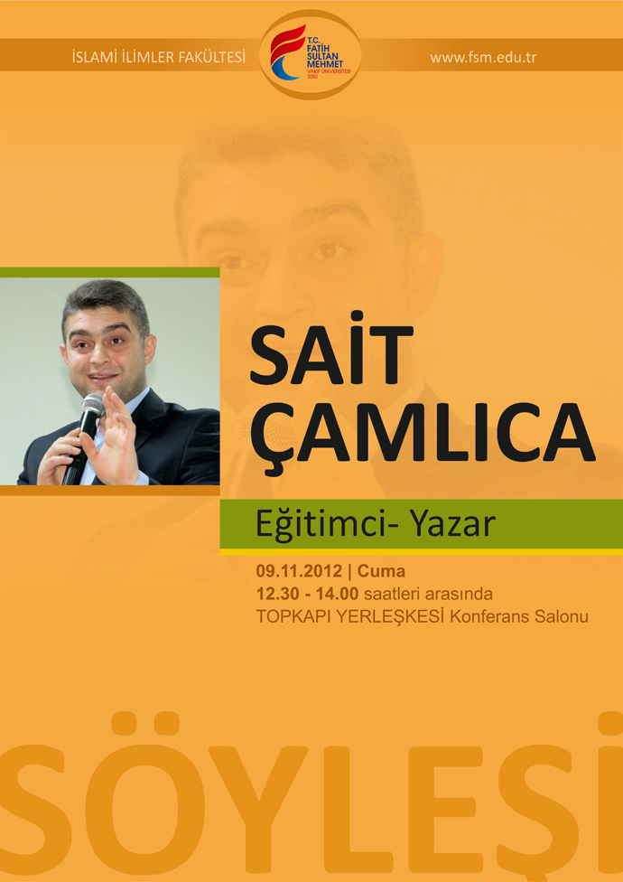 İslami İlimler Fakültemiz tarafından düzenlenen “Eğitimci- Yazar Sait Çamlıca ile Söyleşi” programı, 9 Kasım 2012 Cuma günü 12:30 - 14:00 saatleri arası Topkapı Yerleşkesi Konferans Salonunda, gerçekleştirilecektir.