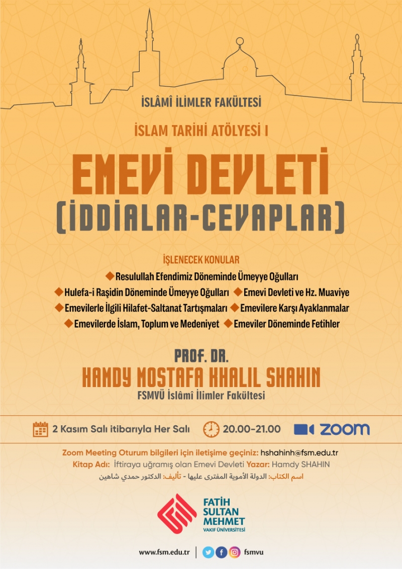 İslam Tarihi Atölyesi I kapsamında yapılacak olan dersler 26 EKİM itibariyle her hafta perşembe günleri akşam saat 20.00-21.00 arasında online olarak gerçekleştirilecektir. Dersin dili Arapçadır.