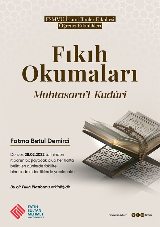 Fıkıh literatürünün en temel eserlerinden sayılan ve Hanefî fıkhı içerisinde “el-Kitâb” olarak bilinen “Muhtasaru’l-Kudûrî”, Ebü’l-Hüseyn Ahmed b. Ebî Bekr Muhammed b. Ahmed el-Kudûrî tarafından kaleme alınmıştır. Üzerine pek çok şerh ve haşiyelerin yazıldığı bu kıymetli eser kendinden sonra telif edilen ve Hanefi Mezhebi’nin ana kaynaklarından sayılan pek çok esere de temel teşkil etmiştir. Haftada bir gün ders yapılarak tamamı okunması hedeflenen bu eser ile Hanefi Mezhebi’nin fıkıh temelleri bilgisinin kazandırılması, mükellefin lehine ve aleyhine haklarının anlatılması amaçlanmaktadır.