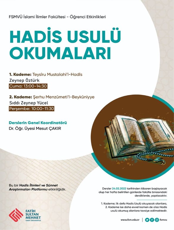 Fakültemizde temel hadis usûlü eğitimi almak ve hadis ihtisasına ön hazırlık yapmak isteyen öğrenciler için hadis anabilim dalı öğretim üyesi Dr. Mesut Çakır hocamızın koordinatörlüğünde hadis usulü dersleri düzenlenmektedir. Okunan eserlerin her biri bu alandaki öne çıkan eserlerdendir. Daha önce hadis usulü eğitimi almamış öğrenciler için fakültemiz dördüncü sınıf öğrencilerinden olan Zeynep Öztürk “Teysîru Mustalahi'l-Hadis” kitabı, daha önce okuma geçmişi olan öğrenciler için ise fakültemiz yüksek lisans öğrencisi Sıddı Zeynep Yücel tarafından “Şerhu Manzûmeti’l-Beykûniyye” kitabı okutulmaktadır.