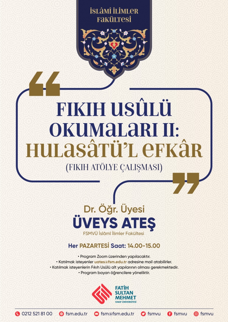 Program kapsamında hâlihazırda Kâsım b. Kutluboğa’nın Fıkıh Usulü alanında telif ettiği “Hulâsatü’l-Efkâr Şerhu Muhtasari’l-Menâr” adlı eser okutulmaktadır. Bu eser, Osmanlı medreselerinde asırlarca ders kitabı olarak okutulmuş, Hanefî ilim çevrelerinde geniş kabul görmüş, üzerine pek çok ilmi çalışma yapılmış olan Nesefî’nin “Menâru’l-Envâr” adlı eserinin İbn Habîb el-Halebî tarafından yapılan muhtasarının şerhidir. Eser klasik Hanefî Fıkıh Usûlü Literatüründe başlangıç seviyesinde bir kitaptır.