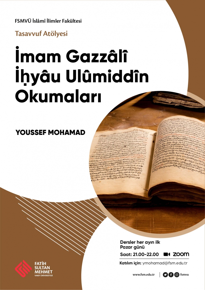 Tasavvuf Atölyesi çalışmaları kapsamında fakültemiz hocalarından Youssef Mohamad Hattar, İmam Gazzâlî’nin meşhur eseri olan İhya okumalarına başlayacaktır. Derslerde, İhya’nın üçüncü cildi yani insanın mânevî, ahlâkî yönü, nefsin terbiye edilmesi, yeme içme ve cinsel arzuların kontrol altına alınması, dilin âfetleri; gazap, kin ve haset; dünyanın anlamı ve önemi; cimrilik ve mal tutkusu; mevki tutkusu ve riya; kibir, kendini beğenmişlik ve kuruntu (gurur) konularının ele alındığı -Mühlikat- kitabı, Gazzâlî’nin diğer kitaplarından da yararlanılarak açıklamalı ve ayrıntılı bir şekilde işlenecektir.