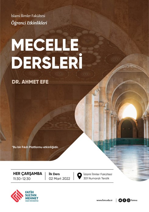 Mecelle-i Ahkâm-ı Adliye veya kısa adı ile Mecelle, 1868-1876 yılları arasında Ahmet Cevdet Paşa başkanlığındaki bir komisyon tarafından Hanefi fıkhının içtihatlarından yola çıkılarak tedvin edilen Türk hukuk tarihinin ilk medeni ve borçlar kanunudur. Hem Türk hukuku hem de İslam hukuku açısından önem arz eden bu eser, fakültemiz emekli öğretim üyesi Dr. Ahmet Efe hocamız tarafından her çarşamba saat 11.30-12.30 arasında fakültemizde ders olarak okutulmaktadır.