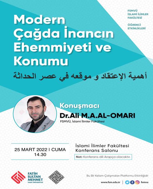 Günümüzde inanç problemleri büyük bir sorun teşkil etmektedir. Fakülte öğrencilerimizi bu konuda bilgilendirmek adına platformumuz tarafından fakülte konferans salonunda okulumuzun da verdiği eğitime uygun olarak hem Arapça hem Türkçe seminerler yapılması planlanmaktadır. Bahsi geçen konferansların ilki ise fakültemiz öğretim üyesi Dr. Ali Al-Omari hocamızın anlatımıyla, “Modern Çağda İnancın Ehemmiyeti ve Konumu”adlı konferans düzenlenmiştir.