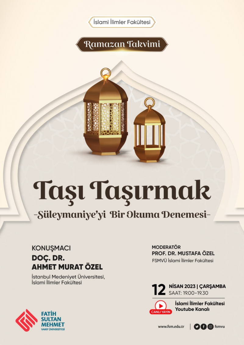 Fakültemiz öğretim üyelerinden Prof. Dr. Mustafa Özel, Ramazan Takvimi söyleşilerinde bu akşam Taşı Taşırmak’ın yazarı İstanbul Medeniyet Üniversitesi öğretim üyelerinden Doç. Dr. Ahmet Murat Özel’i konuk ediyor. Mimar Sinan’ın, medeniyetimizin kusursuz tezahürü olarak inşa ettiği Süleymaniye Camii’nin anlam ve hikmetinin konuşulacağı programa konuklarımızı bekliyoruz.