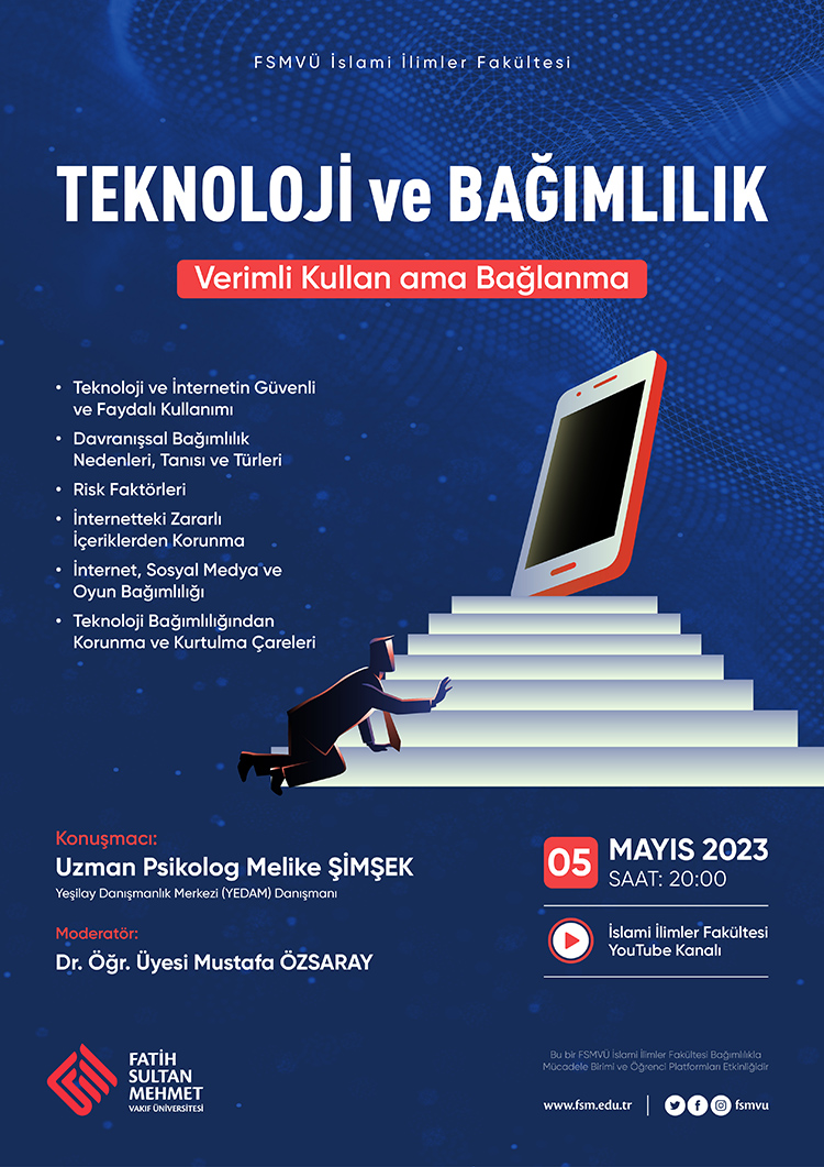 FSMVÜ İslami İlimler Fakültesi Bağımlılıkla Mücadele Birimi ve Öğrenci Platformları işbirliği ile düzenlediğimiz bu konferansta Uzman Psikolog Melike Şimşek konuşmacı olacaktır. Akademik ve idari personelimizi, öğrencilerimizi ve halkımızı 05.05.2023 Cuma günü saat 20:00 de İslami İlimler Fakültesi YouTube Kanalı’ndan canlı olarak yayınlanacak konferansa bekliyoruz.