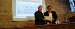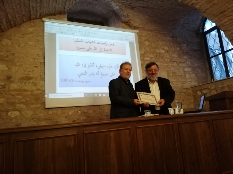 Konferans sonunda Arapça İlahiyat Programı Koordinatörlüğü adına Dr. Abdullah Tırabzon tarafından Halil İbrahim Kutlay hocaya Katılım Belgesi takdim edildi.