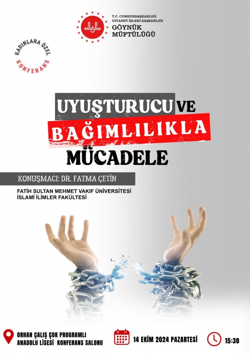 Göynük Müftülüğünce organize edilen, "Bağımlılıkla Mücadele" başlıklı seminerde konuşma yapan Dr. Öğr. Üyesi Fatma ÇETİN'in her türlü bağımlılığın zararlarından, korunma yollarından bahsettiği seminerde halkımızın yoğun ilgi gösterdiği görüldü.