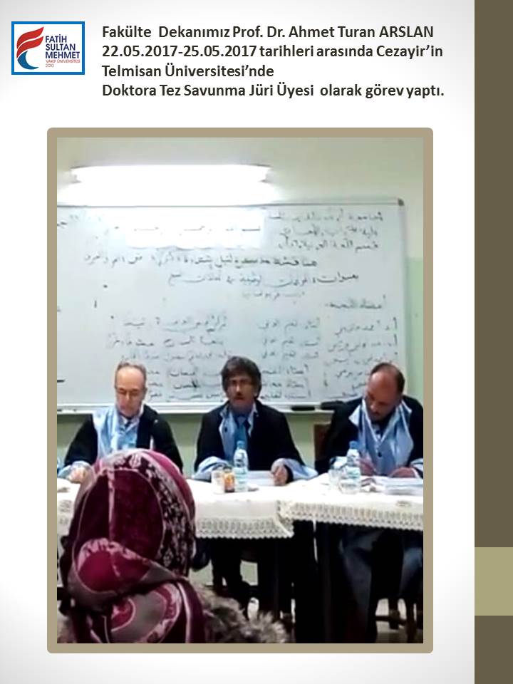 Fakülte Dekanımız Prof. Dr. Ahmet Turan Arslan 22.05.2017-25.05.2017 tarihleri arasında Cezayir’in Telmisan Üniversitesi’nde Doktora Tez Savunma Jüri Üyesi olarak görev yaptı.