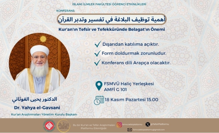 Kur'an ilimlerinde belagat, hem lafzın hem de mananın mükemmelliğini anlamada kilitlenmiş bir özelliğe sahiptir. Tefsir çalışmalarında, Kur'an'ın mucizevi üslubunu tanıtma imkânı sunuyor. Bu bağlamda, “Kur'an'ın Tefsir ve Tefekküründe Belagat'ın Önemi” başlıklı konferansımızda, bu derin konuyu ele aldık. Fatih Sultan Mehmet Vakıf Üniversitesi Kur'an ve Tefsir Araştırmaları Platformu olarak düzenlediğimiz konferans, 18 Kasım 2024 Pazartesi günü saat 15.00'te FSMVÜ Haliç Yerleşkesi'nde Dr. Yahya Al-Gavsani Hoca ile gerçekleşti.