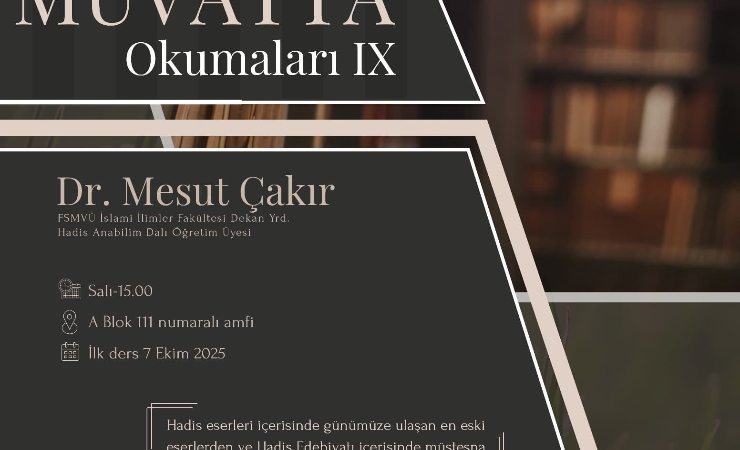 Hadis Platformu olarak düzenlediğimiz, Muvatta dersleri Fakültemiz Dekan Yardımcısı ve Hadis Anabilim Dalı Öğretim Üyesi Dr. Mesut Çakır rehberliğinde gerçekleştirilecektir. Dersler her Salı saat 15.00’te, Haliç Kampüsü A Blok 111 numaralı amfide yüz yüze, aynı zamanda Zoom üzerinden online olarak yapılacaktır.
