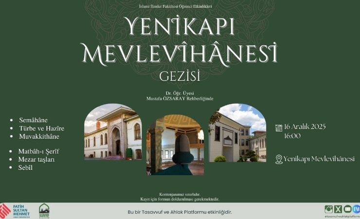 İslami İlimler Fakültesi Öğrenci Etkinlikleri kapsamında, Tasavvuf ve Ahlak Platformu tarafından 16 Aralık 2025 tarihinde Yenikapı Mevlevîhânesi gezisi düzenlendi. Dr. Öğr. Üyesi Mustafa Özsaray rehberliğinde gerçekleştirilen etkinlik, öğrencilerin tasavvuf kültürünü yerinde tanımalarına imkan sundu.